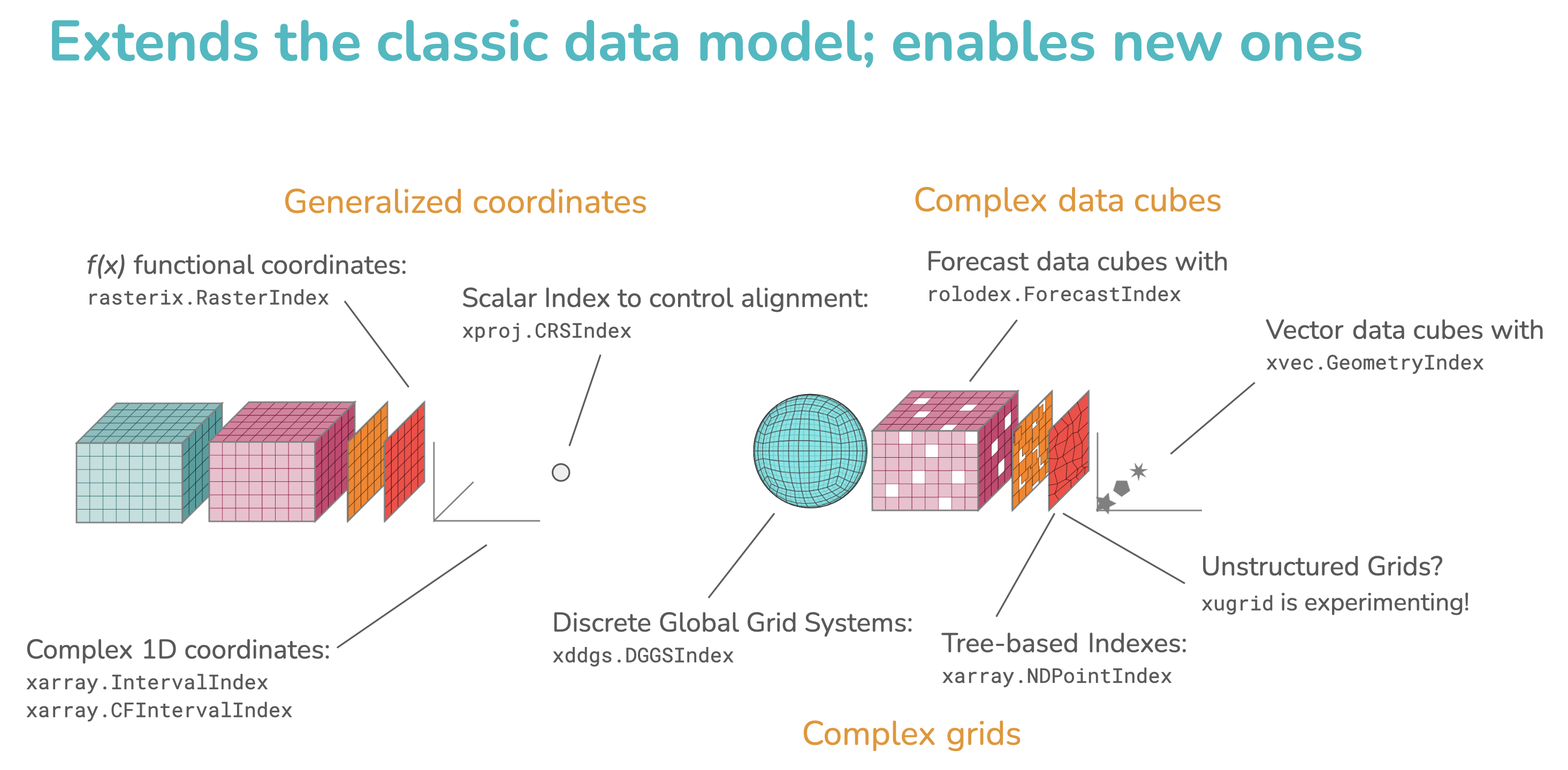 In addition to a few new built-in indexes, xarray.Index provides an API that allows dealing with coordinate data and metadata in a highly customizable way for the most common Xarray operations such as sel, align, concat, stack. This is a powerful extension mechanism that is very important for supporting a multitude of domain-specific data structures. Here are a few examples below.